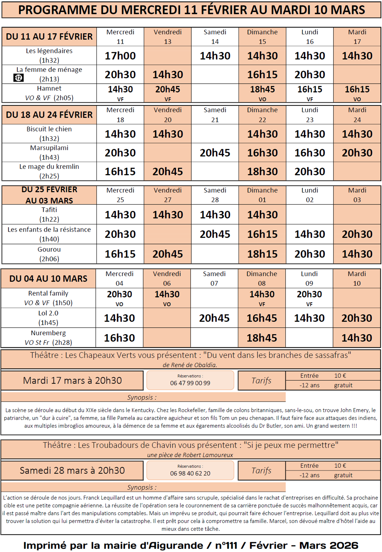 Programme du Cinéma Aigurande de février et mars 2026 - Mairie de Montchevrier